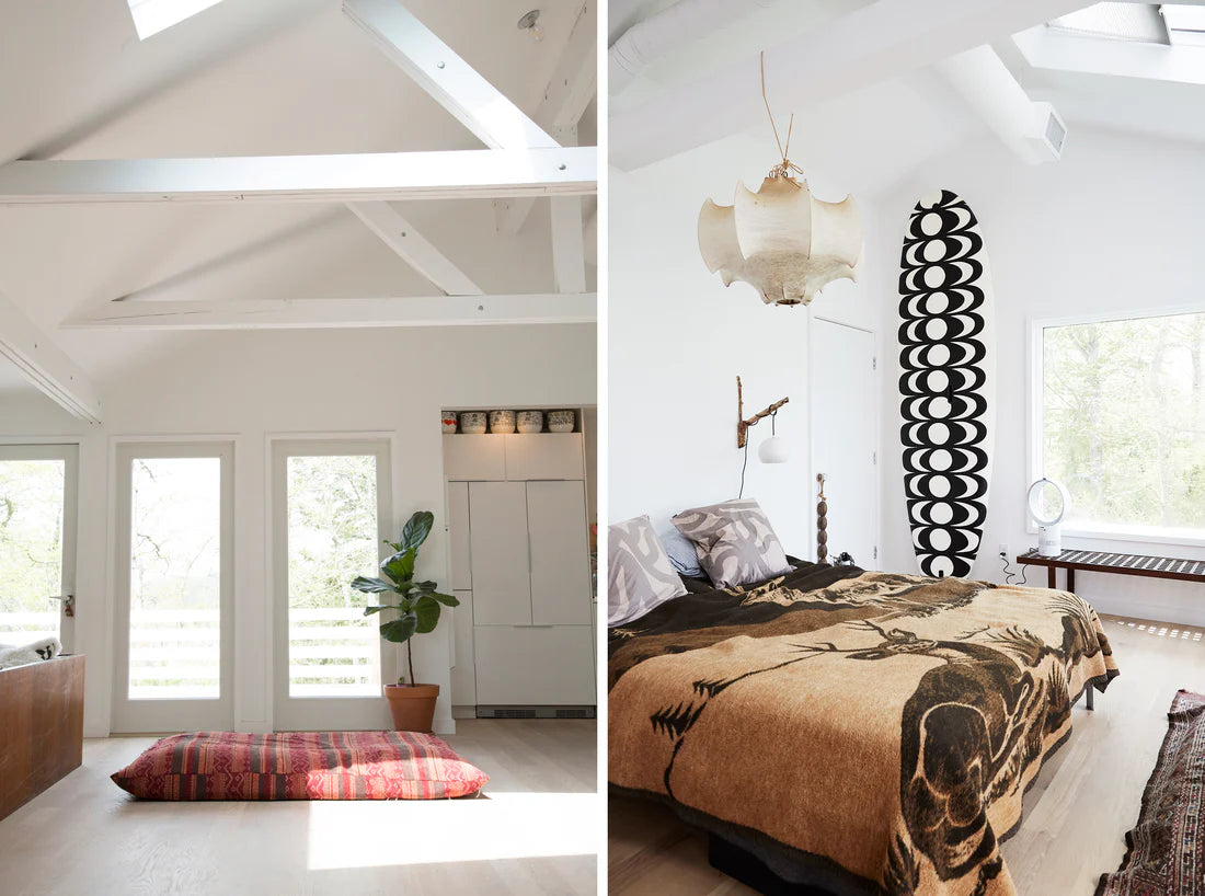 Maya Schindler is an accomplished fine artist, professor and vintage huntress. But her super power may actually be harnesser of light. She moved from New York to L.A. and back again, bringing with her a desire to beam as much sun and warmth into a house as humanly possible. 42 windows (I just counted, and my house only has 10) and an insane collection of vintage hardware and lighting later, Maya has redeemed her move back east with a home that glows. Here, a quick glimpse at her bedroom and living room before jumping into her simple and dramatic bathroom…
