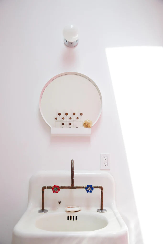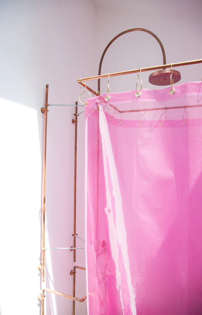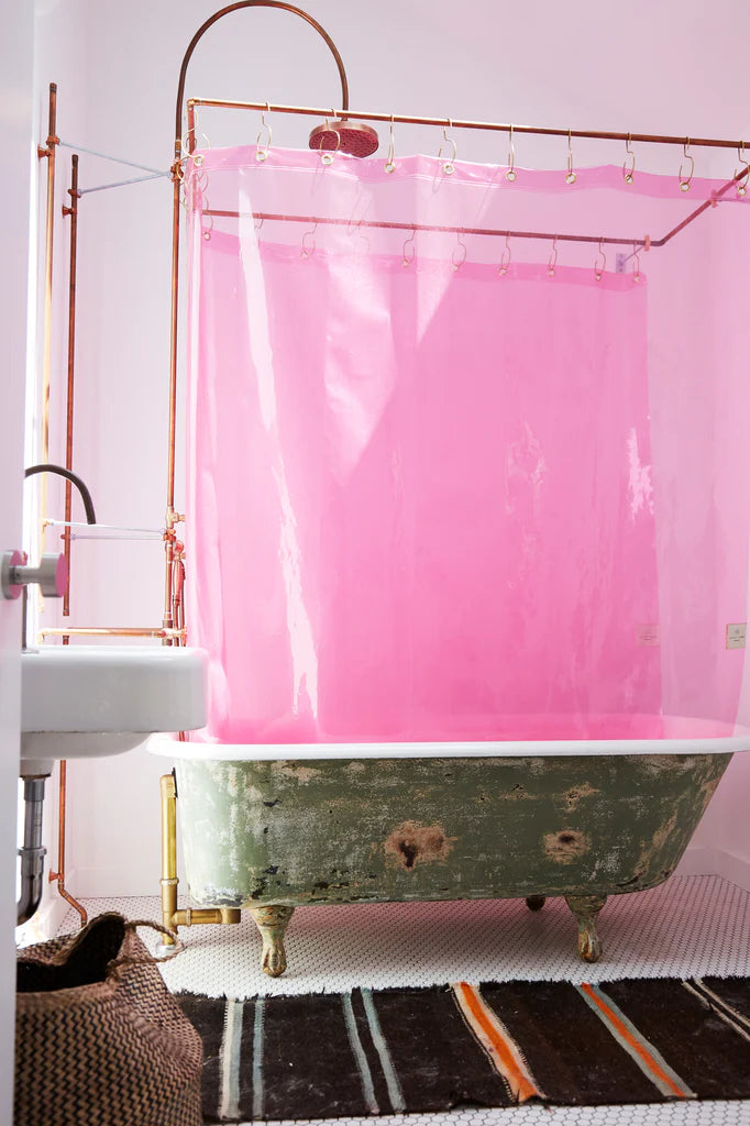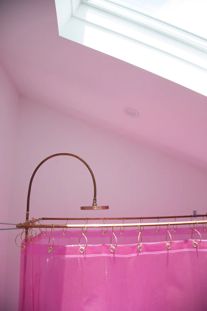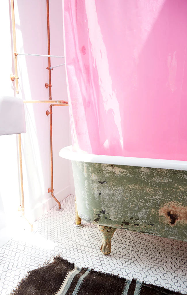 I came across your product online and the colored vinyl stuck with me. Our little house has 42 windows (and skylights) and one of my biggest passions is lighting up a space (I have a good size vintage lighting collection). When I planned our bathroom I knew we would have a skylight, and I loved the idea of being able to transform the space with light. I wanted to give the space a new “edge” when it came to the styling…adapting to tradition, but giving it a fresh look. Your pink shower curtain stopped me in my tracks!