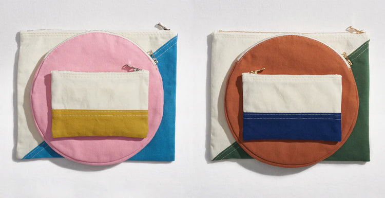 Our "Threes" pouch set is a collection of 3 color-blocked, double-sided pouches made from up-cycled, 10 oz canvas.