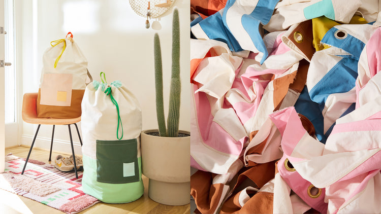 Introducing Re:Canvas Project #17, Color-blocked laundry backpacks! Made from 100% up-cycled Quiet Town canvas and finished with recycled nylon and recycled plastic trim. Use the large front pocket for laundry sheets and small pocket for quarters. We know how laundry can pile up so we reinforced the bottom 1/3 of the bag with two layers of canvas to support heavy loads.