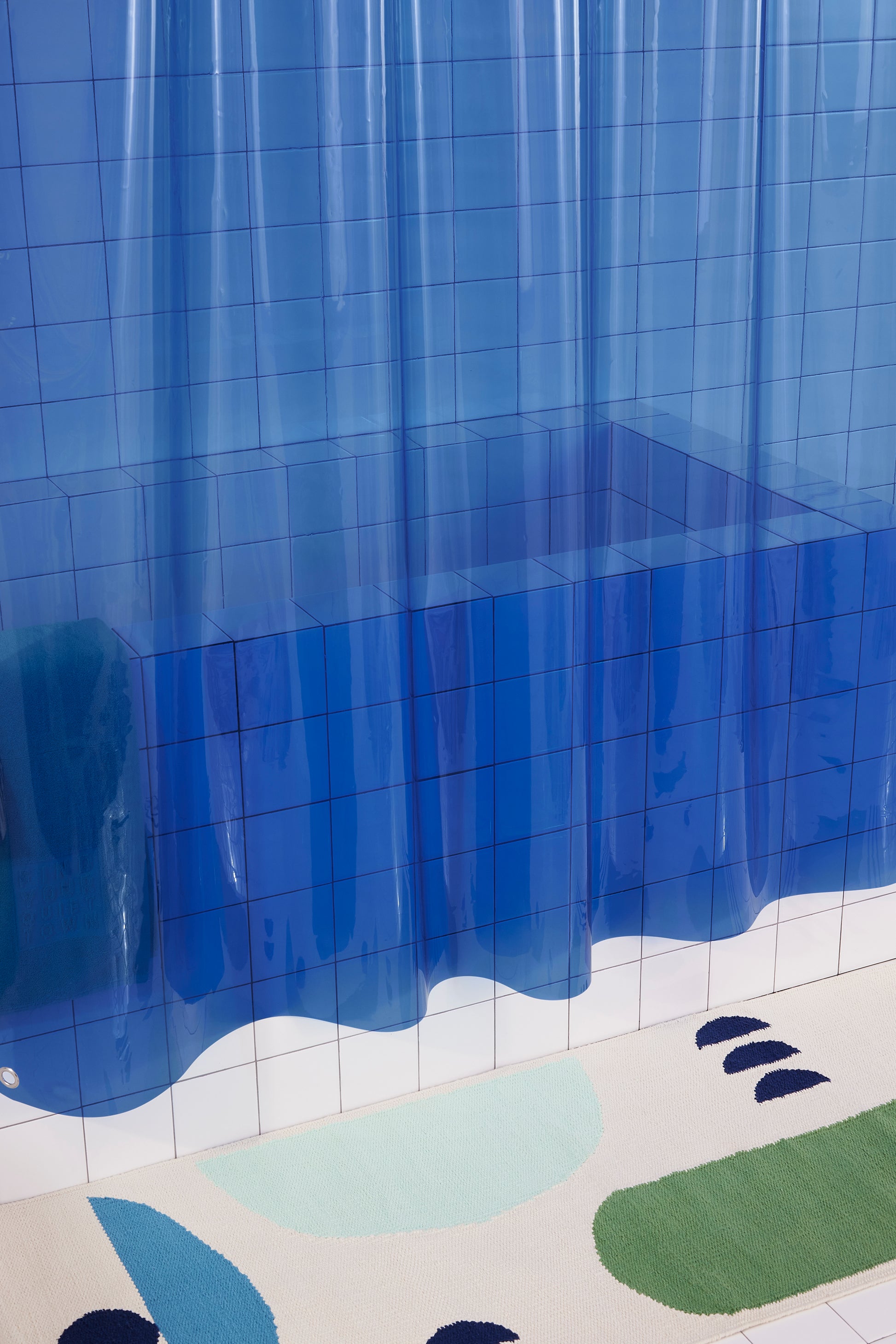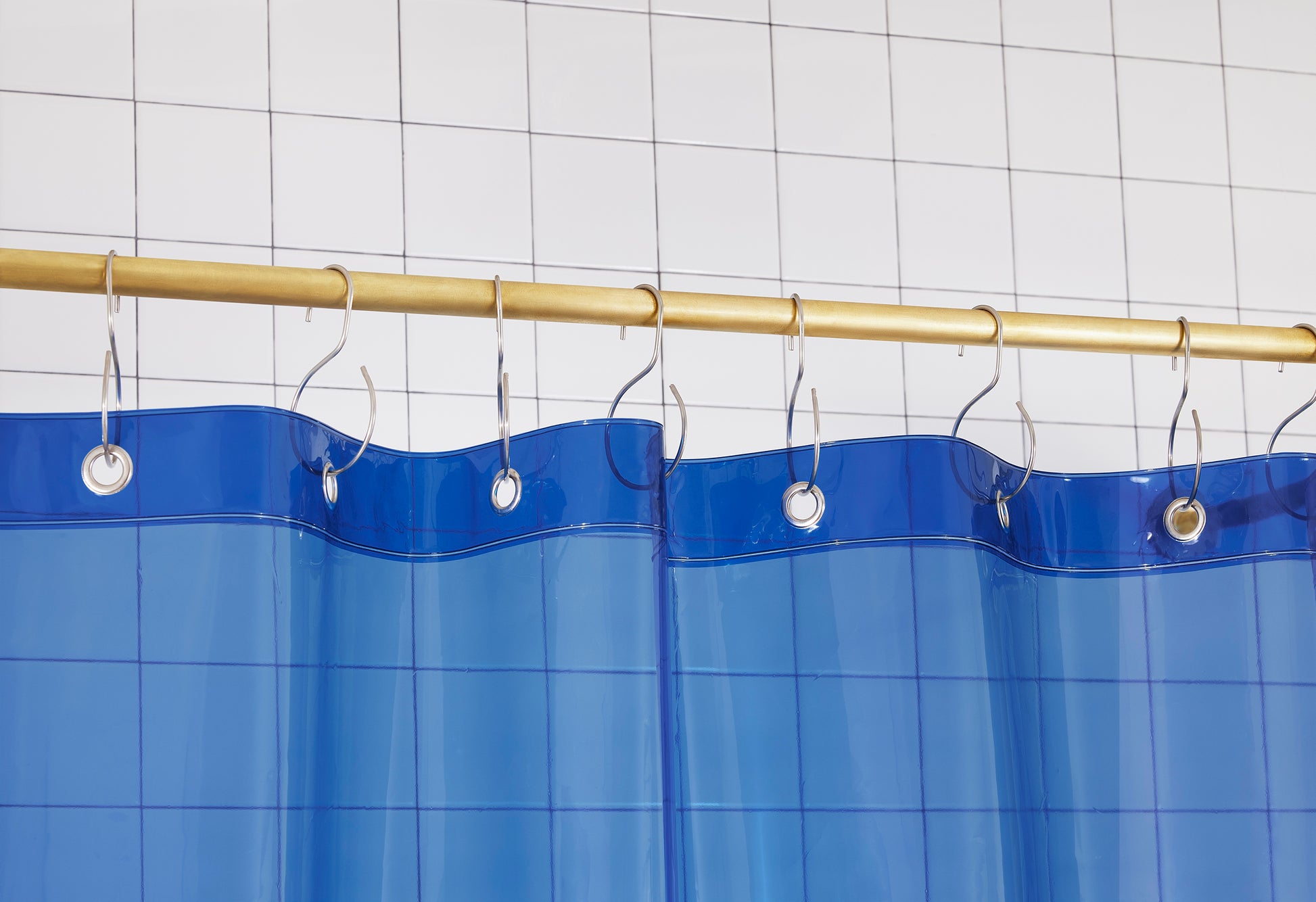 "Brings an edgy splash of color to your bathroom in the form of a brightly hued, transparent shower curtain. It can be used alone or as a liner with a fabric shower curtain."