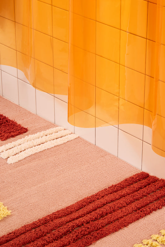 Our color-blocked Orient Sun Shower shower curtains are made from non-toxic EVA vinyl plastic that is chlorine-free, PVC-free, and BPA-free. Use them as a standalone curtain or shower curtain liner.
