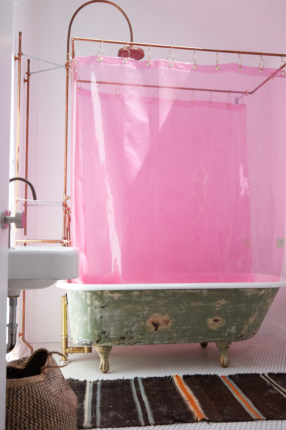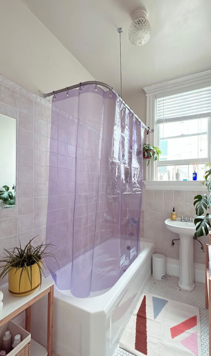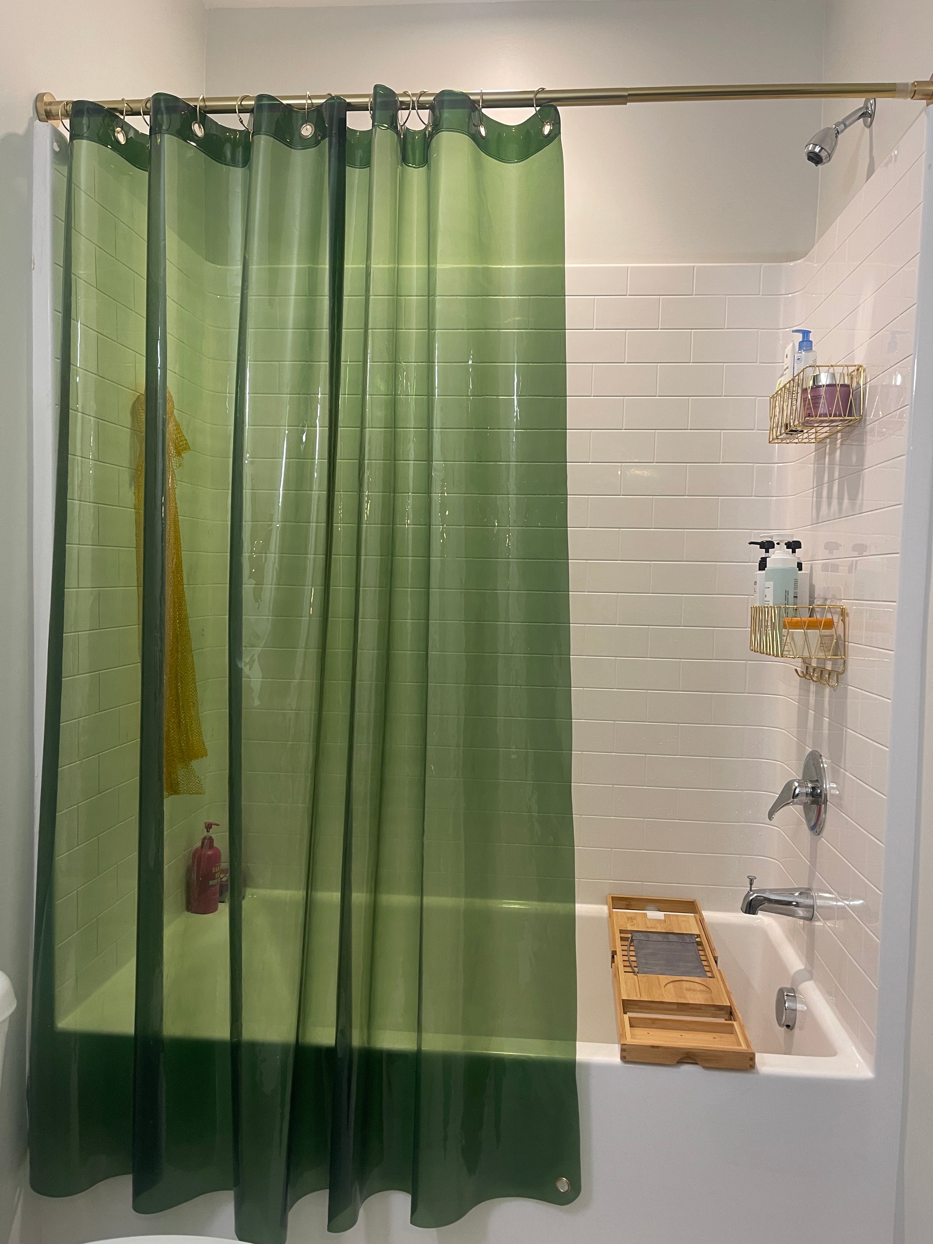 • "Brings an edgy splash of color to your bathroom in the form of a brightly hued, transparent shower curtain. It can be used alone or as a liner with a fabric shower curtain."