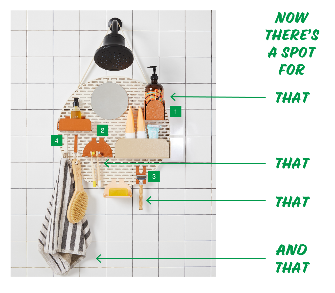 Introducing The Spot, a modular shower organizer that hangs over your shower head or mounts to the wall. Everything about The Spot can be customized just for you: The strap-length is adjustable, the storage accessories move around, you can even add things on, depending on what you need. You don’t even have to use it in the shower! The Spot is a great catch-all for front-door clutter like sunscreen, mail and keys. No matter what you’ve got, there’s a spot for it. The Spot was designed in collaboration with the award-winning Brad Ascalon Studios, NYC